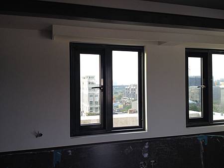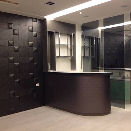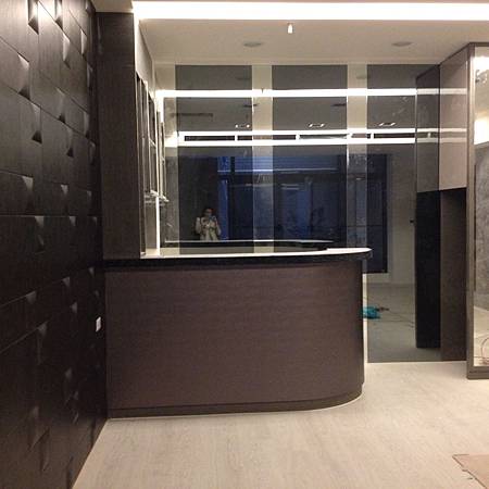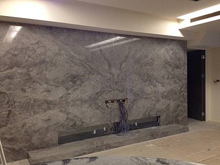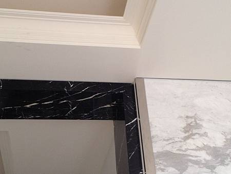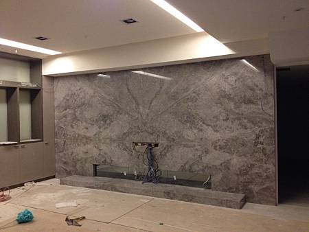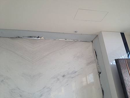 客廳電視牆大理石邊角與鏡面不銹鋼箱保護膜待撕除