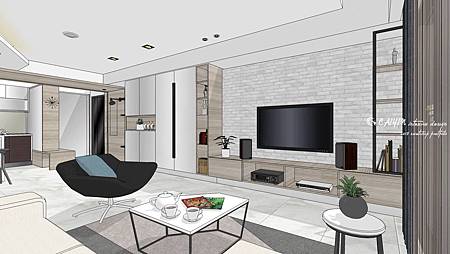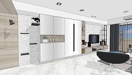 延續著玄關質感,一直來到客廳.客廳採用文化石表現北歐休閒氣氛,並且透過梧桐木