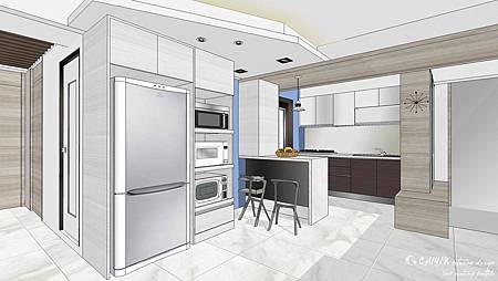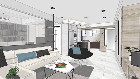 在廚房的小空間上,突顯並強化客廳空間落落大方.
