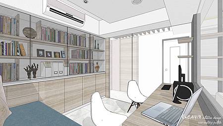 書房大面積採用透明玻璃來對應客廳,使得空間可以擁有多功能使用機會.