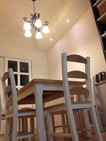 經典鄉村風格吊燈襯托餐廳簡單修飾的天花板,也補足透天空間樓高較高的問題