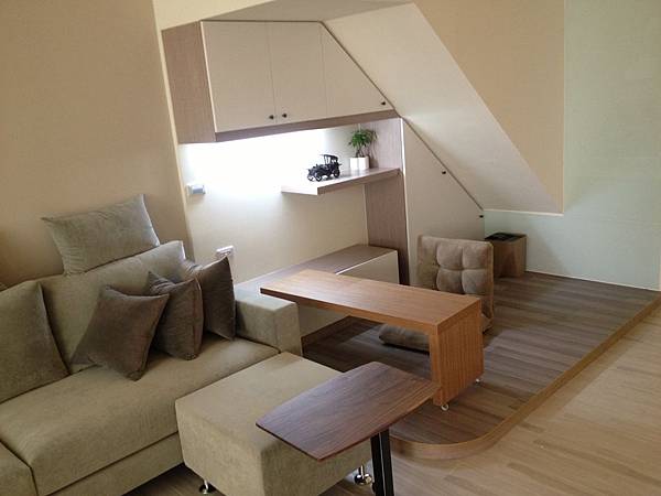 簡單的型體,一張旋轉壁桌,一片層架,及照明就是客廳裡休閒的小空間,