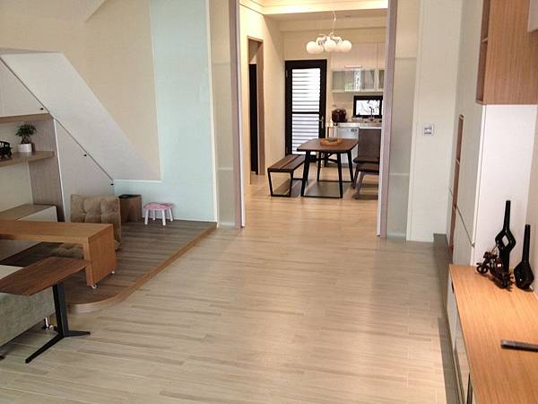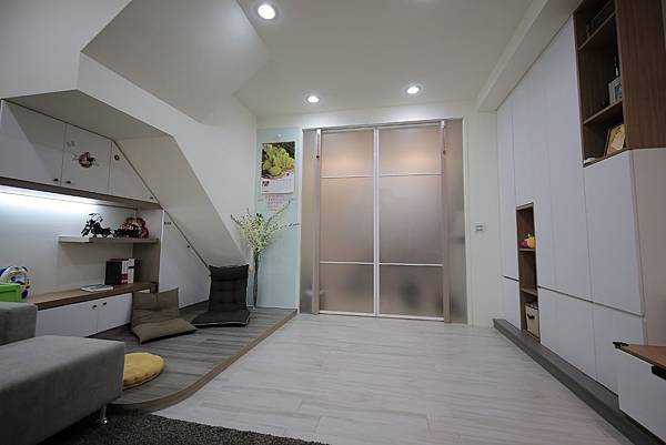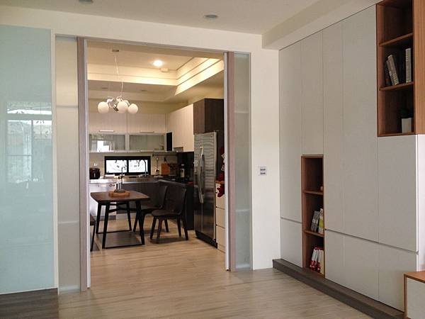 - 整體櫃子採白色與木頭色做呼應,一直延伸至大門入口,別有一番風味。