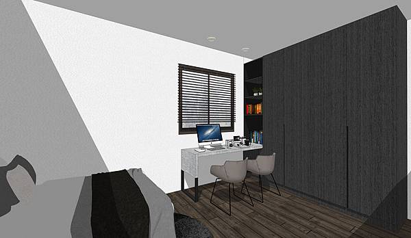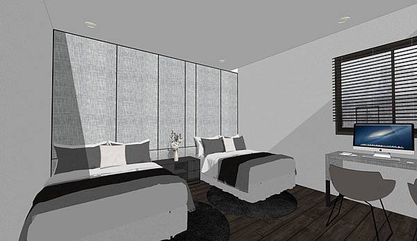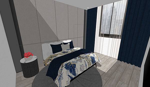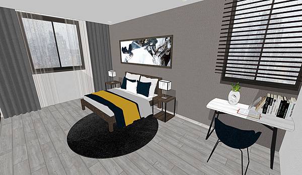 次臥室空間床頭背牆以灰色木紋及鐵件包框增加空間的立體感,
