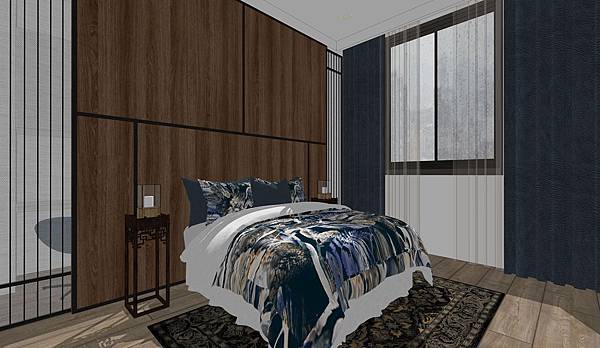 床頭背牆使用垂直與水平間的線條律動,搭配上穩重且雅緻的木紋紋理,