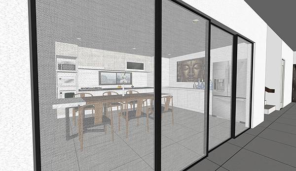 廚房空間將原有牆面打除,以鋁框玻璃拉門取代,
