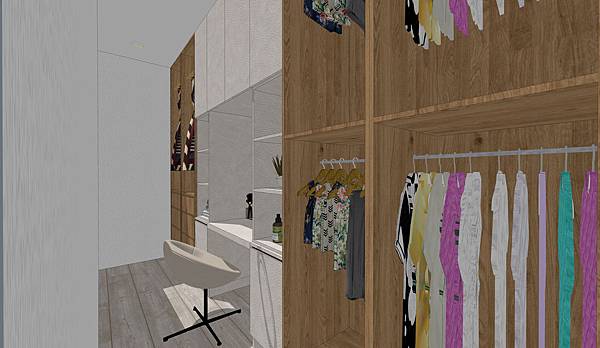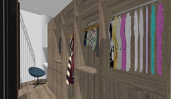 主臥室更衣室以開放系統衣櫃保留動線位置,