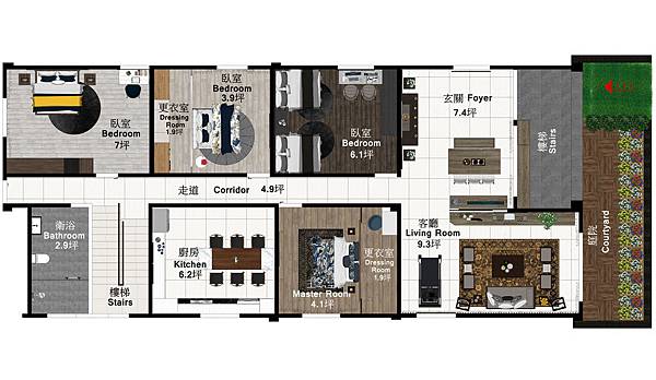 空間設計 : 客廳空間、餐廳空間、臥室空間、更衣室空間