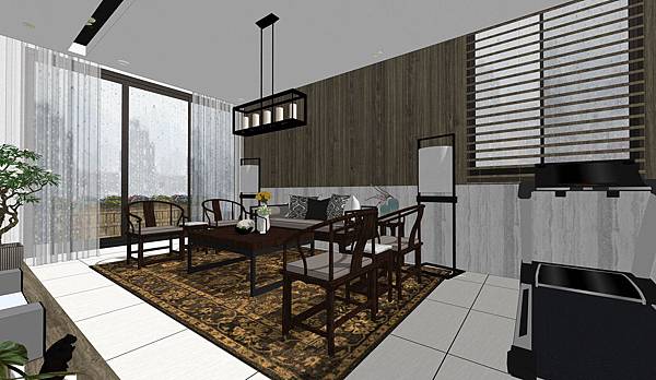 溫潤的木紋顏色巧妙的與中式風格作為搭配,並以鐵件的俐落與中式的線條巧妙呼應,