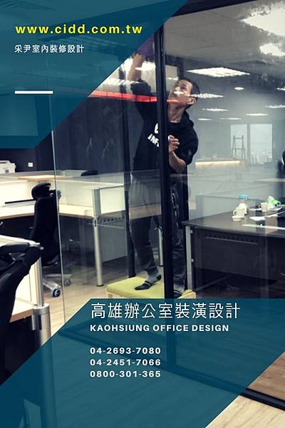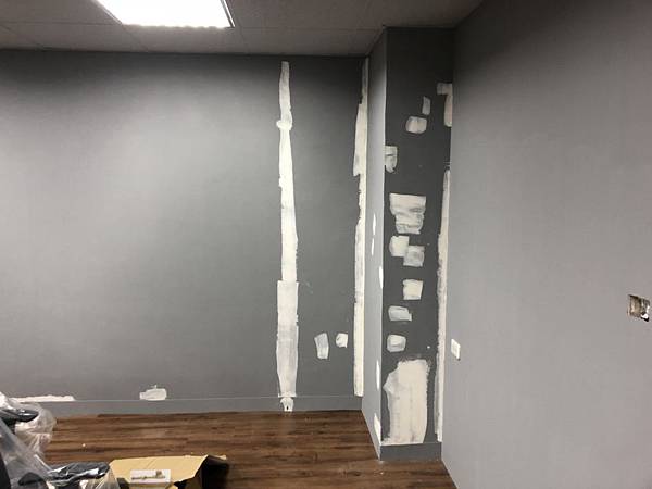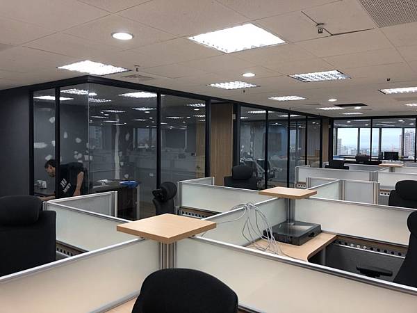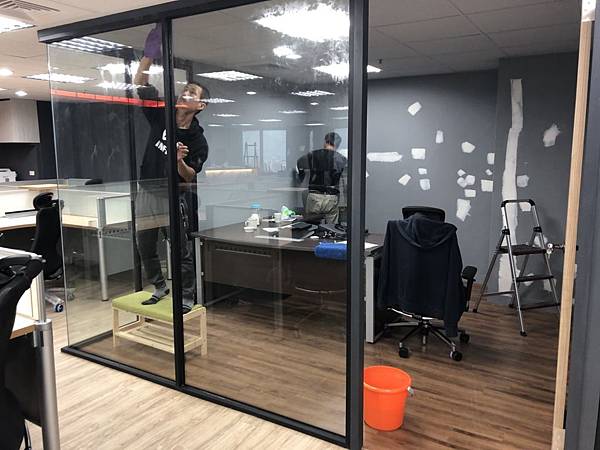 牆面油漆收尾作業、鋁框玻璃隔間清潔待玻璃紙貼附