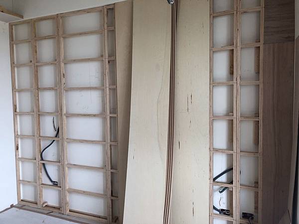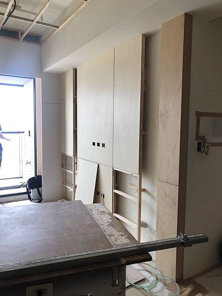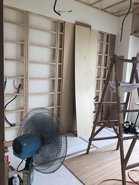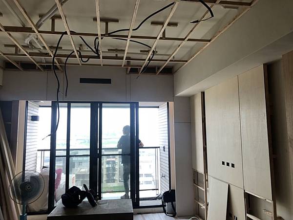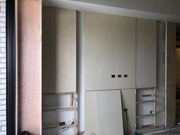 客廳空間木作造型電視牆施工中